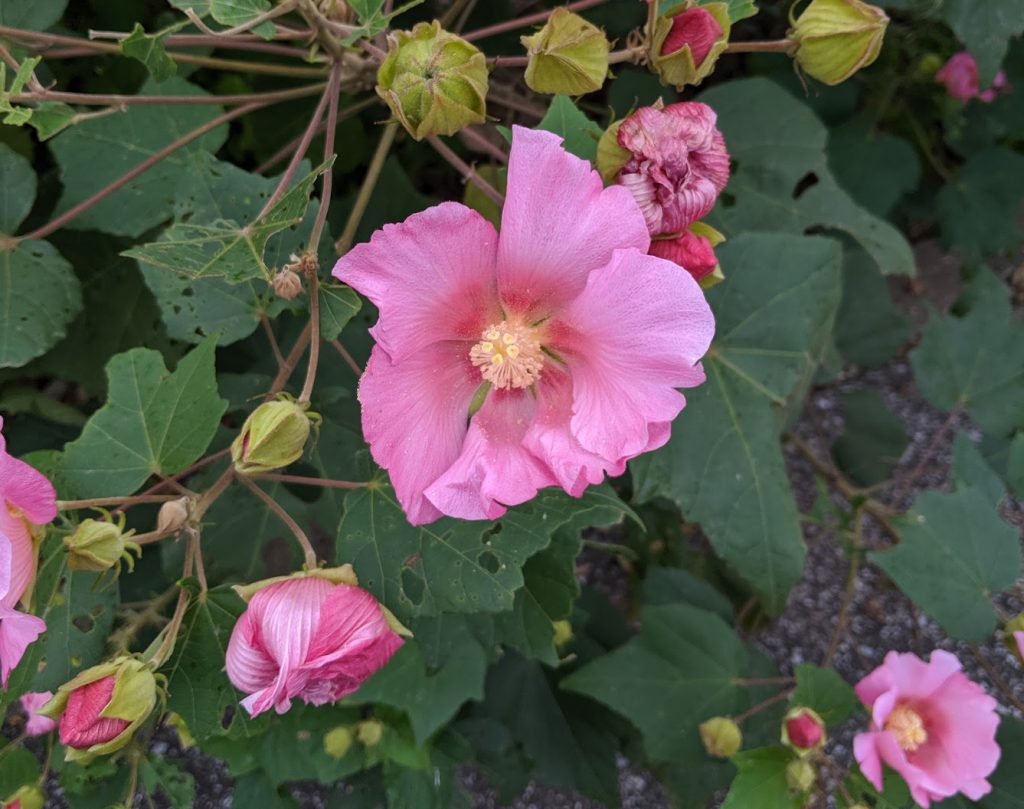 フヨウの花色はピンクや白で、花は5枚の花びらをつけます。フヨウの花は朝咲いて夕方には萎む「一日花」ですが、花期の間は次々と途切れることなく開花します。