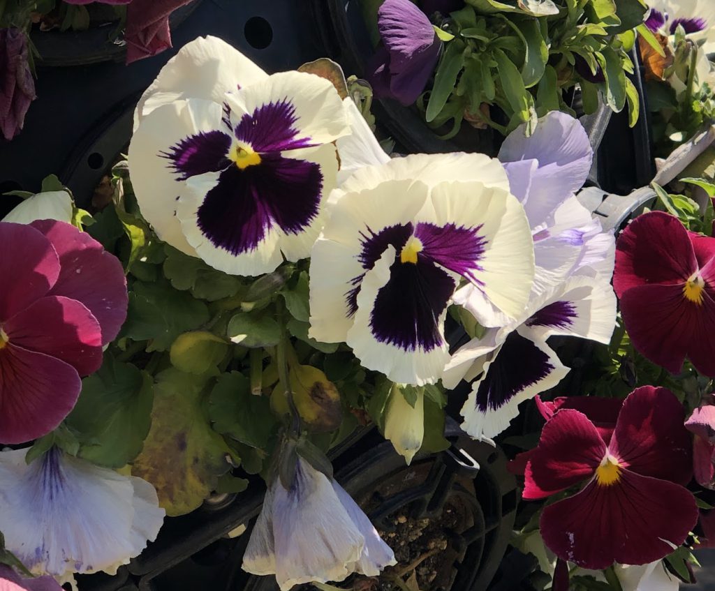 パンジーの花色には紫、白、ピンク、オレンジ、黄色、赤、青、茶、黒、複色などがあります。