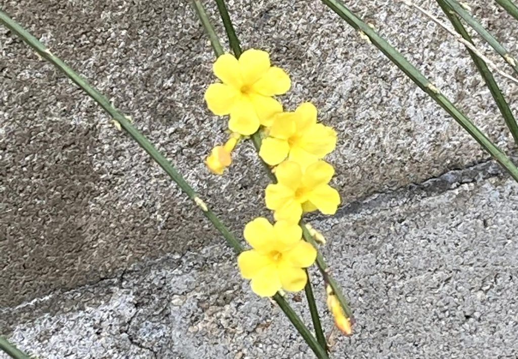 オウバイには中国名「ゲイシュンカ(迎春花)」と英名「ウインタージャスミン」とがありますが、どちらも早春から開花するところにちなみます。