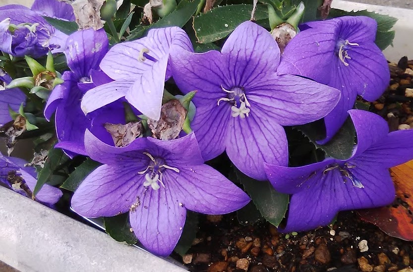 キキョウの花色は紫や青の他にピンクや白もあり咲き方は一重咲きの他に八重咲き、大輪種、花が最後まで開かない袋咲きの品種もあります。キキョウは色や咲き方が多い上に草丈が高いものから矮性種まであるので、庭植えのほか鉢植えで栽培することも可能です。