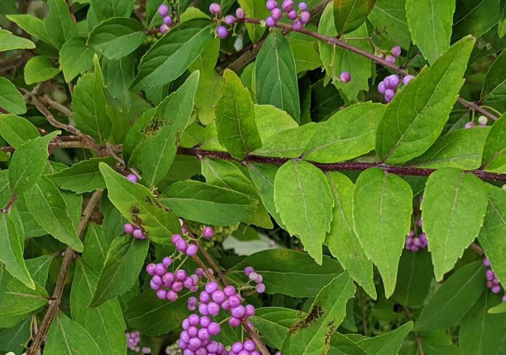 紫色の美しい実をつけるムラサキシキブ(紫式部)は、樹木の実の中では特異な色であることと、実つきも良好なことから庭木としてよく植栽されています。