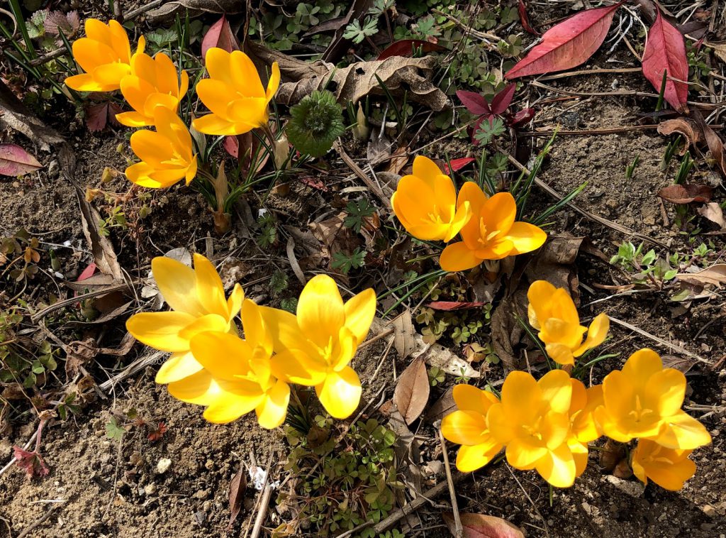 花壇植えでは、クロッカスの代表格ともいえる早咲きの「ラージ・イエロー」や「イエロー・マンモス」、そしてそのあとに続くように咲くベルナス種の紫や白の品種が一般的です。