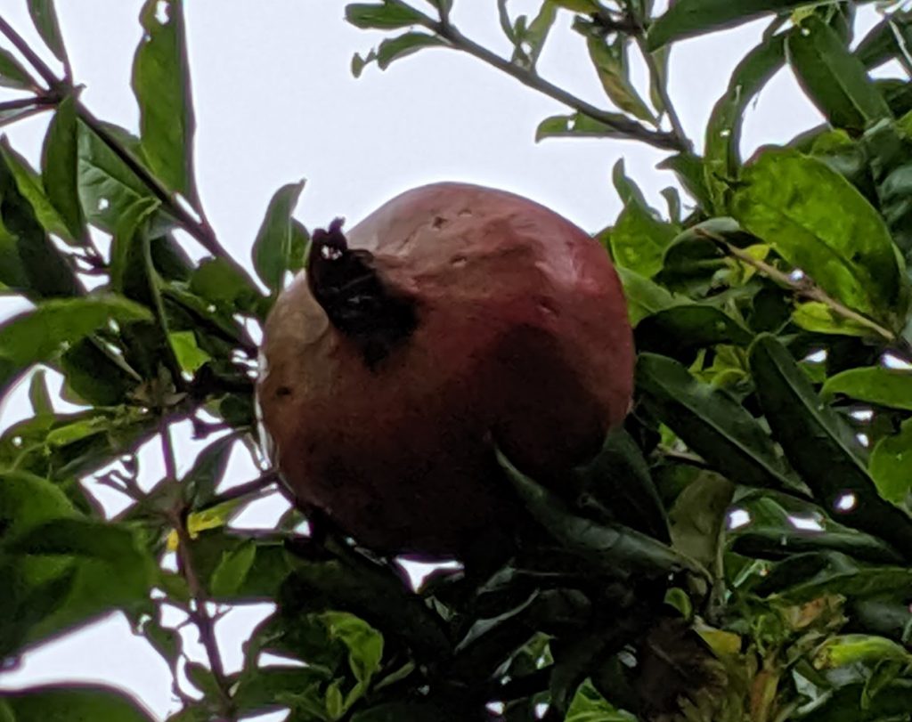 ザクロは果実が割れ始めるころに収穫するのが確実ですが、熟期になって色がよければ、割れていなくても収穫できます。