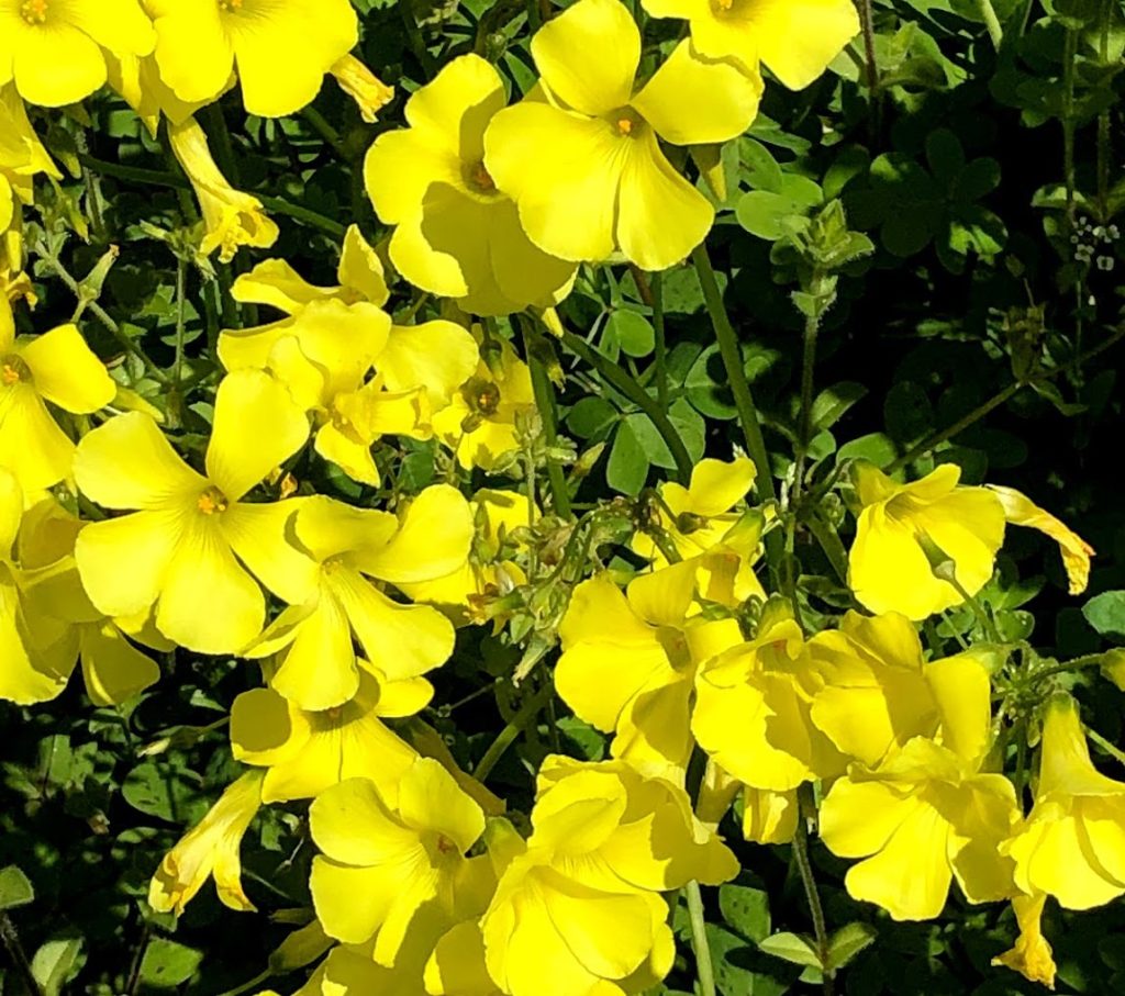 オキザリスの花は夜間や雨天には閉じていて、日中の日ざしを受けると盃状やロート状に大きく開きます。満開のとき株を覆うように咲く様子は非常に見ごたえがあり、人目を引きます。