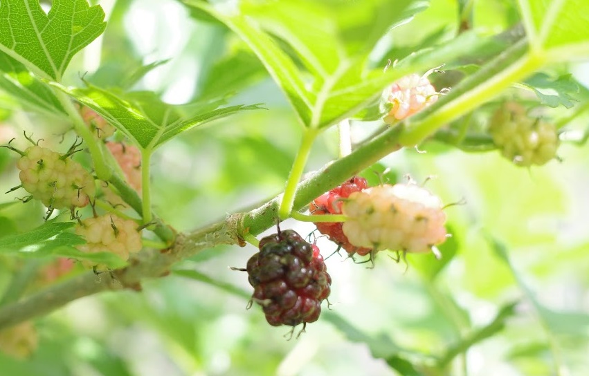 クワの果実は木いちご(ラズベリー)に似ておりムクドリやスズメ、カラスなどが好んで食べます。