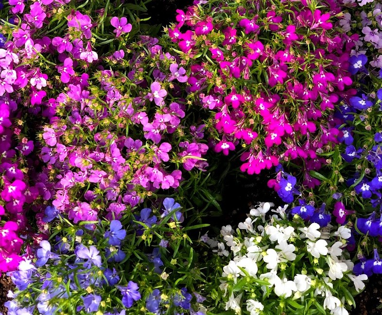 ロベリアの開花時期は、3月下旬~11月上旬です。ロベリアは花径1~2㎝の花が株全体を覆うようにして咲き、遠くから見ると色の塊のように見えます。