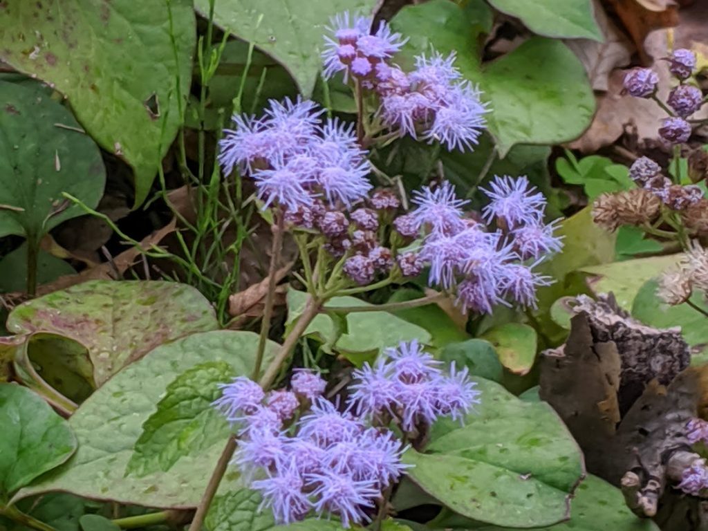 ユーパトリウムは多年草(宿根草)で毎年咲き、地下茎で増えますが、アゲラタムは一年草で、こぼれダネで翌年も新株が生えてくることがあります。