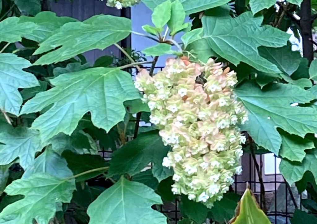 カシワバアジサイの花は咲いてから時が経過して古くなるとピンク色に変わります。