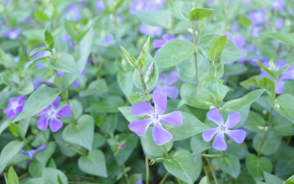 ツルニチニチソウは、寒さや乾燥にも耐え、半日陰でも良く育ち繁殖も株分けで容易にできます。