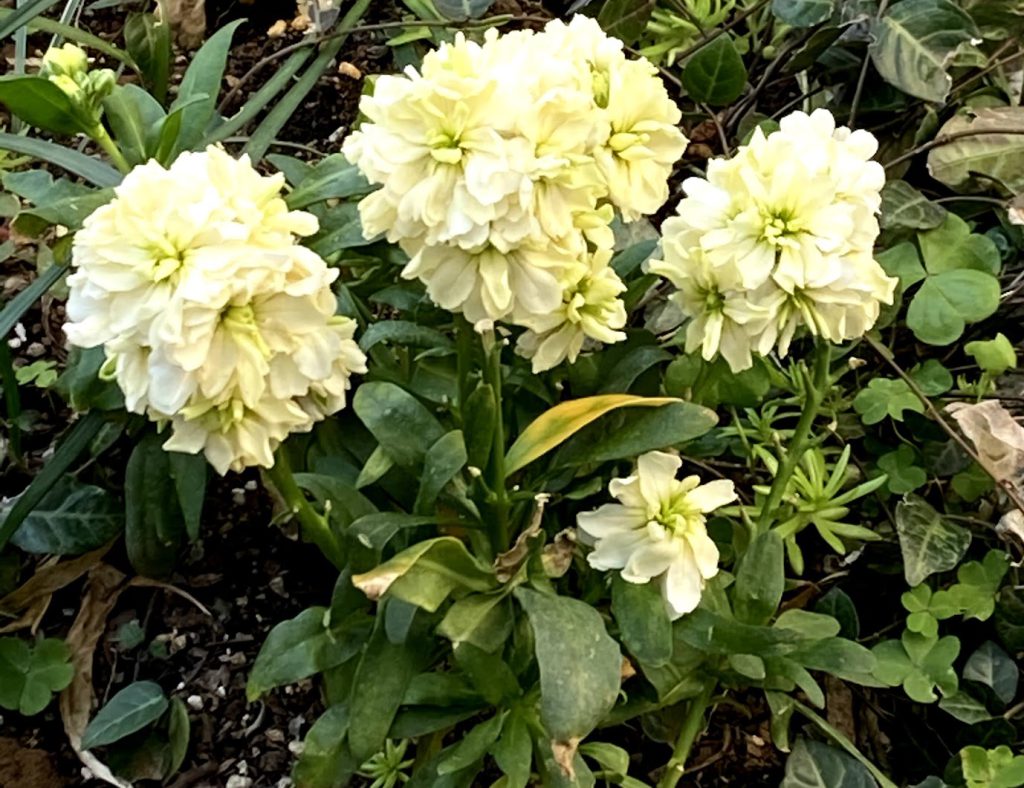 ストックの花色は白、淡いピンク、濃いピンク、赤紫、青紫、パステルイエローなどがあり、咲き進むとともに色が変化していく品種もあります。ストックは花茎を立ち上げて、下から花が咲いていきます。