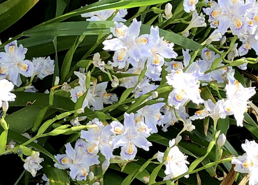 シャガは長い地下茎を伸ばし、地下茎の先に芽をつくってふえるため、大きな群落をつくることが多いです。