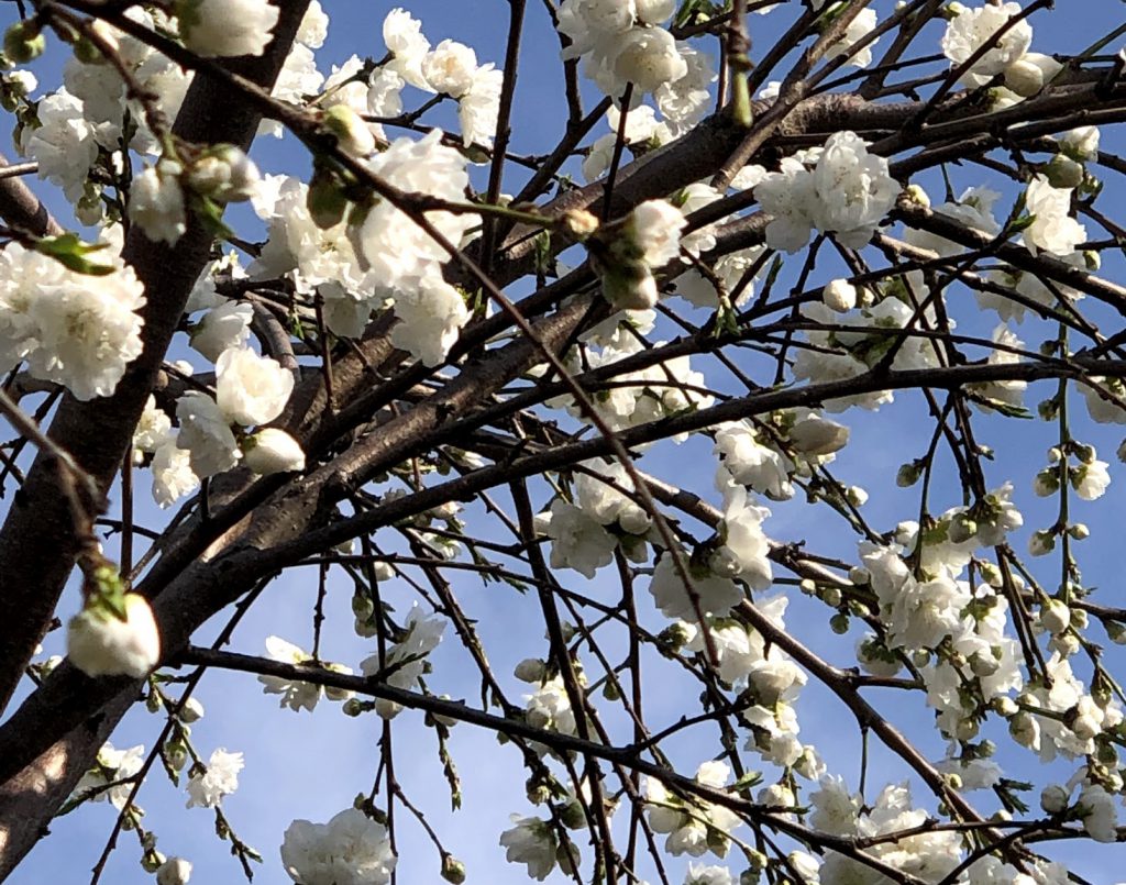 カンパクは「寒白桃(かんぱくもも)」とも呼ばれる白花で中輪、八重咲きのハナモモです。カンパクは白花のハナモモの代表的な品種で、純白の花は透明感があり大変美しく、2月下旬から咲き始める早咲き品種です。