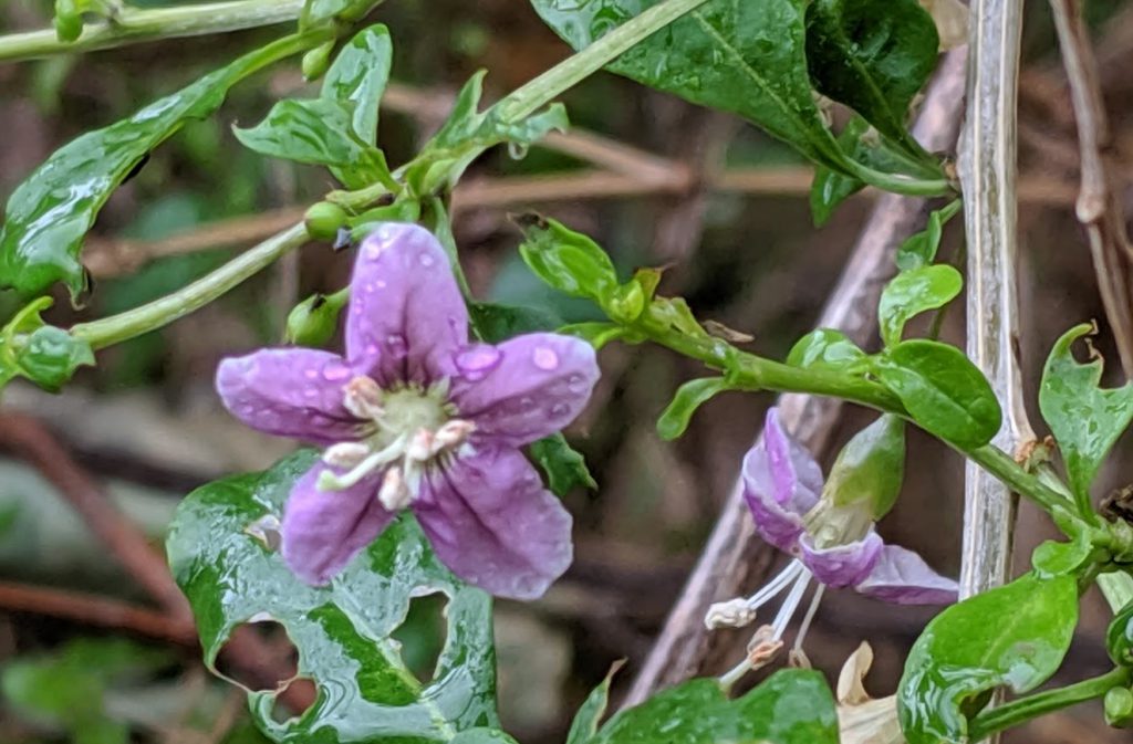 クコの開花時期は7月~11月と長く、淡い紫色の花が1~4輪ほど葉の付け根にぶら下がるように咲きます。