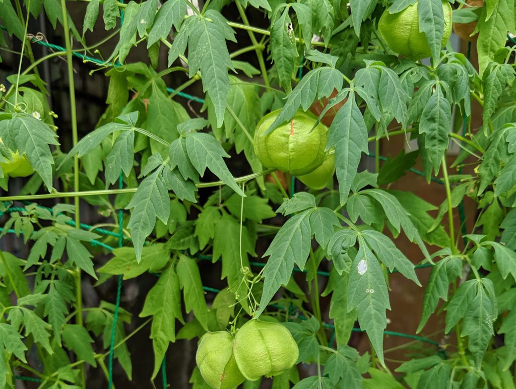 フウセンカズラは、同じつる性植物の「ゴーヤ」に比べると繊細な印象で遮光率は低めですが、風に揺れる果実は見た目にも涼しげで「緑のカーテン」などにもよく使われています。