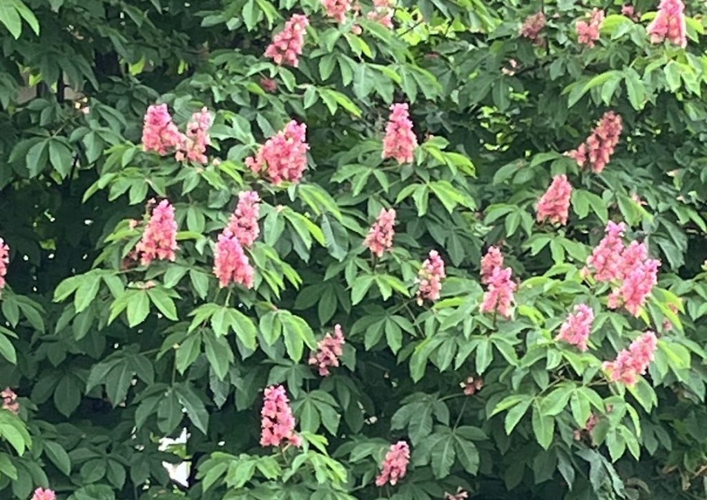 ベニバナトチノキは「ベニバナ」という名前ですが花はピンク色であることが多く、母種のアカバナアメリカトチノキのような濃い赤にはなりません。なおもう一方の親であるマロニエは、淡いクリーム色の花にわずかな赤みが入ります。