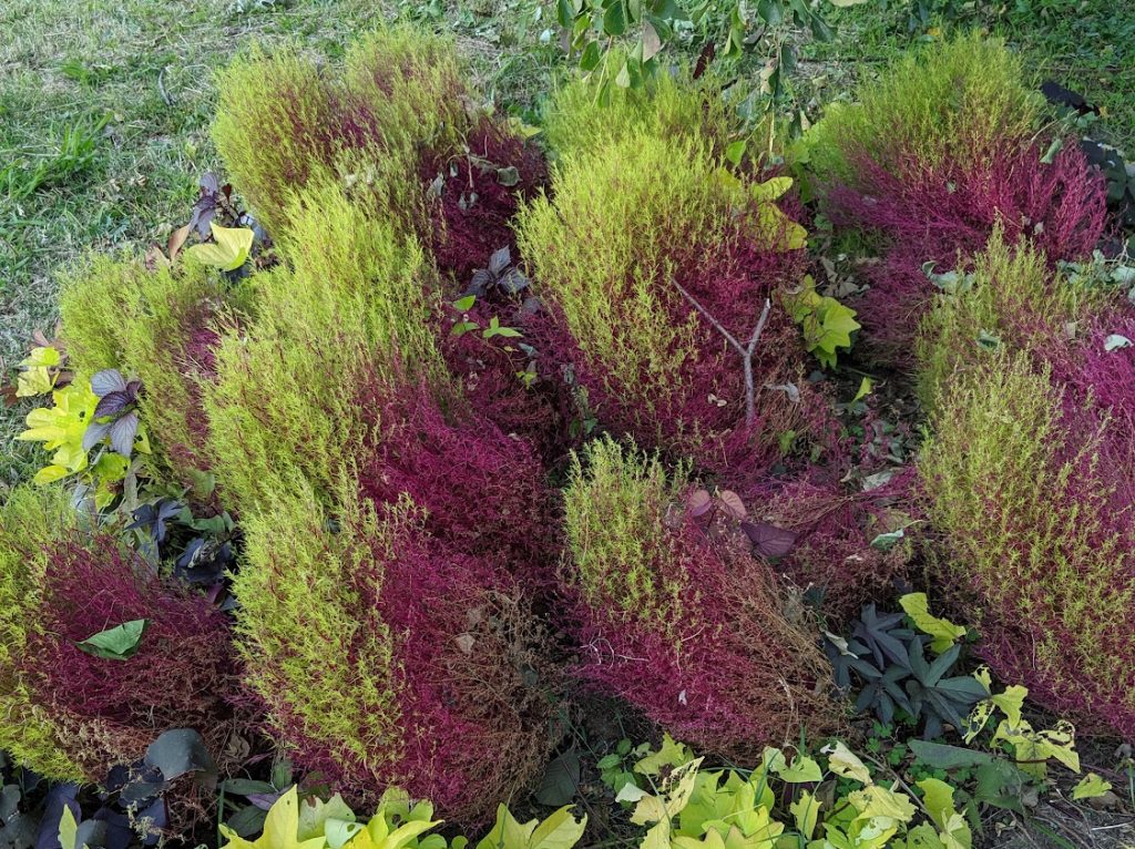 コキアは猛暑にも耐えるので、花が少ない時期に重宝されます。コキアは1株でも美しいですが、広い敷地に群生させたコキアは圧巻の光景です。