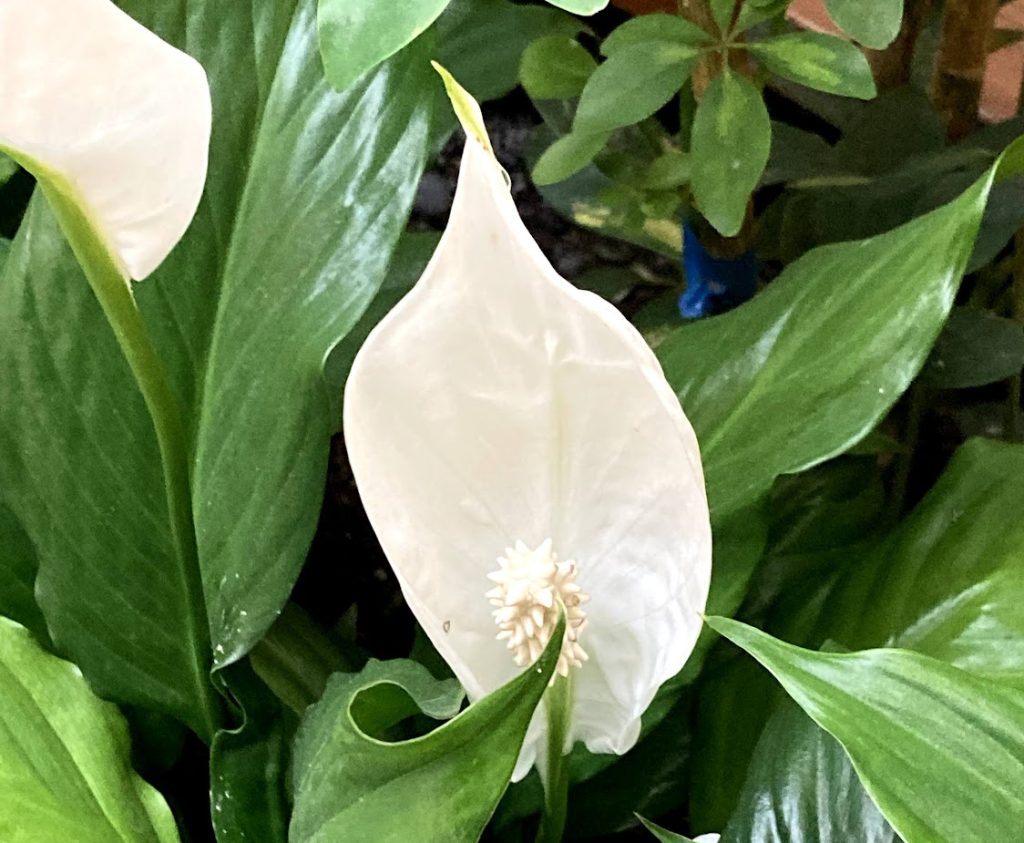 スパティフィラムの開花時期は5~10月です。白い花びらのように美しいのは仏炎苞(ぶつえんほう)と呼ばれる部分で、花は肉穂花序(にくすいかじょ)と呼ばれる部分に多数つきますが、小さく目立ちません。